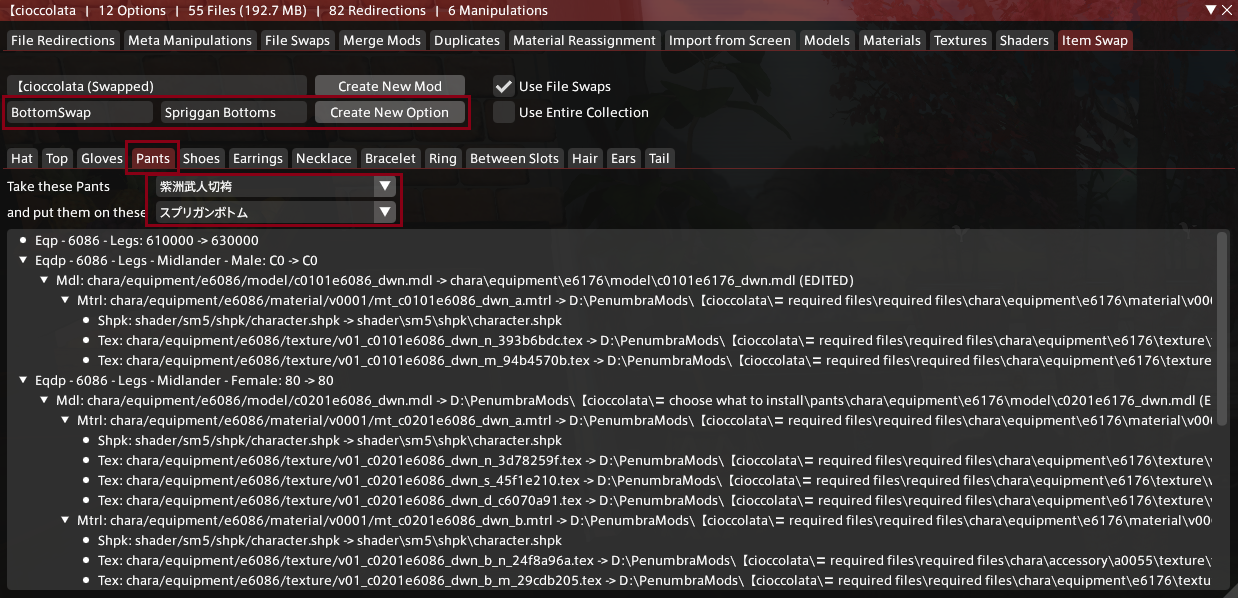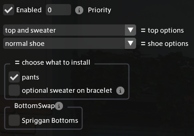 여기서 옵션 범주 이름은 'BottomSwap'으로, 옵션 이름은 'Spriggan Bottoms'로 정했다.