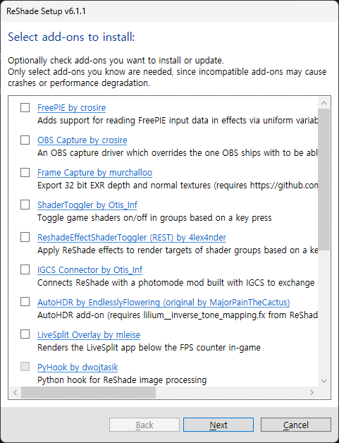 ReShade 설치 / 업데이트 시 해당 애드온을 설치했다면 INI 파일만 다운로드하면 된다.