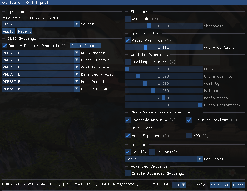 Adds support for FSR 2.1, 2.2, 2.3.2, 3.1, XESS and updates DLSS to the latest version! Allows you to change the default DLSS preset and disables dynamic resolution scaling. An optional preset to keep