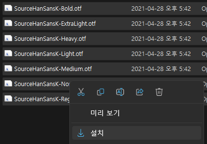 모두 드래그하고 우클릭 후 설치 버튼을 누르면 알아서 모든 폰트의 설치를 진행한다.